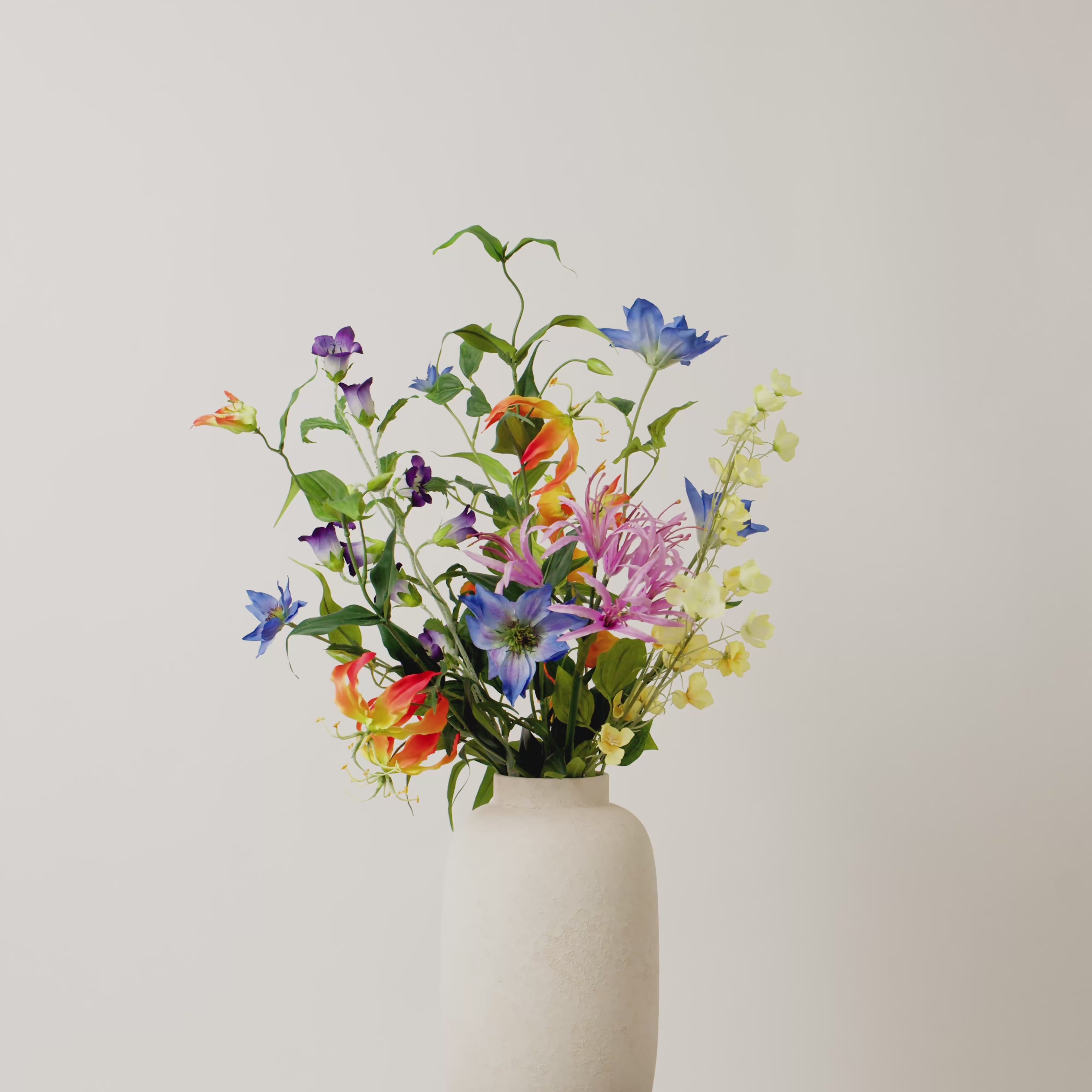 Meet the Good SS.02 silk artificial bouquet: the perfect combination of quality and sustainability for your interior. This beautiful bouquet contains eye-catchers such as the orange gloriosa, orange sandersonia and purple nerine!