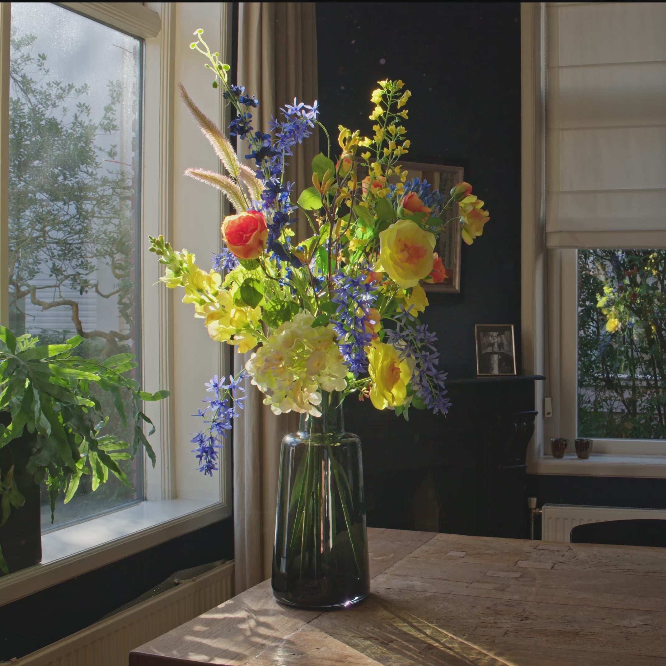 For each seasonal collection, our floral stylists go to great lengths to find and combine the most beautiful materials and colours. One of the silk artificial bouquets where we believe this has been achieved perfectly is the artificial flower bouquet SS.36. Airy and playful, both in shape and colour and at the same time delicate. Bright blue wisteria with the soft yellow colour of the rose. It doesn't get much better than this.