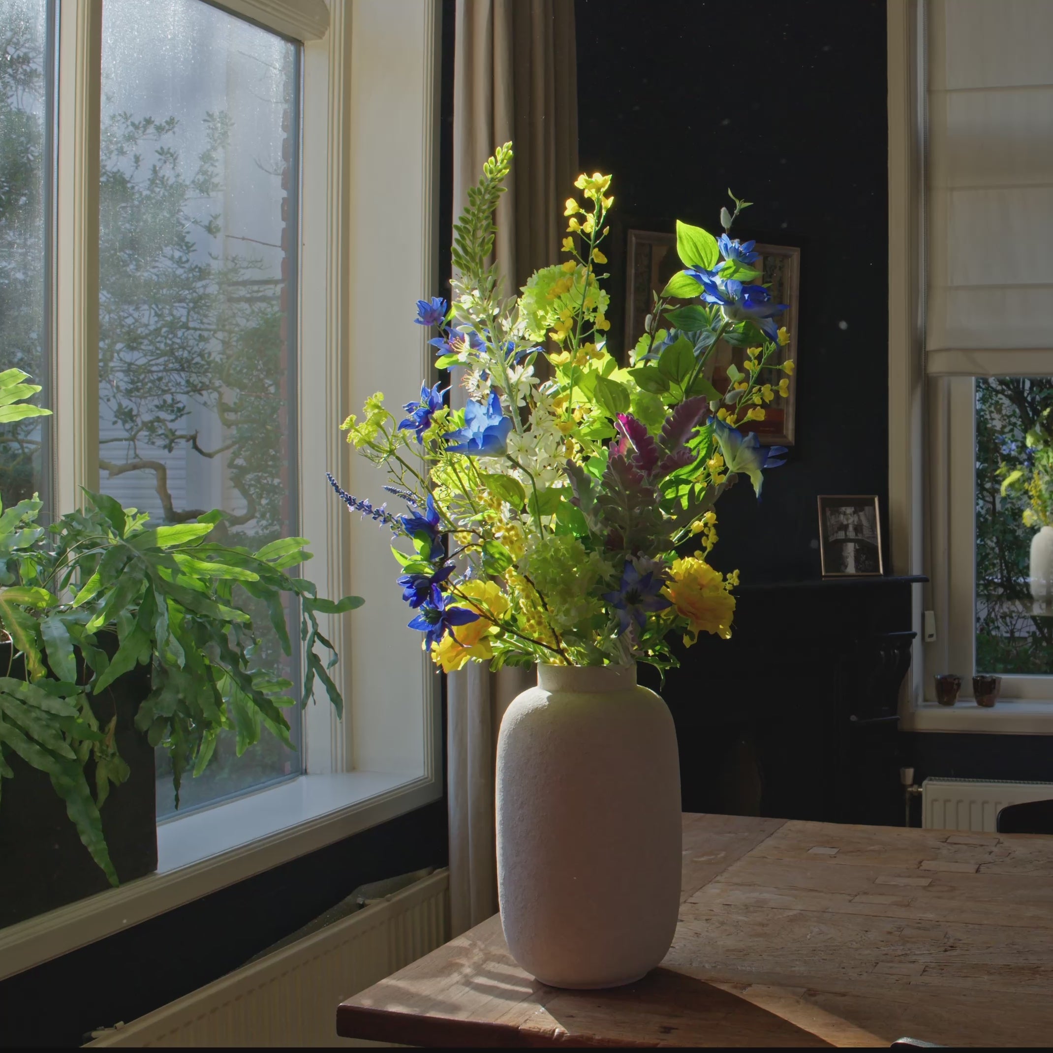 Met een hoogte van ca. 80–90 cm is dit boeket perfect voor een ruime eettafel, een dressoir, keukeneiland of als opfrisser in een woonkamer of entree.
